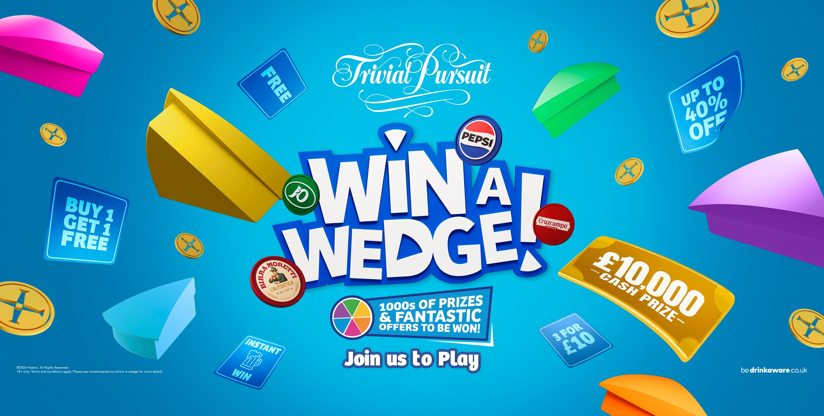 Scan the QR code in pub to play. Answer all six Trivial Pursuit questions correctly for an instant reward or fantastic offer. And here’s the best bit… win or lose, you could win £10,000.